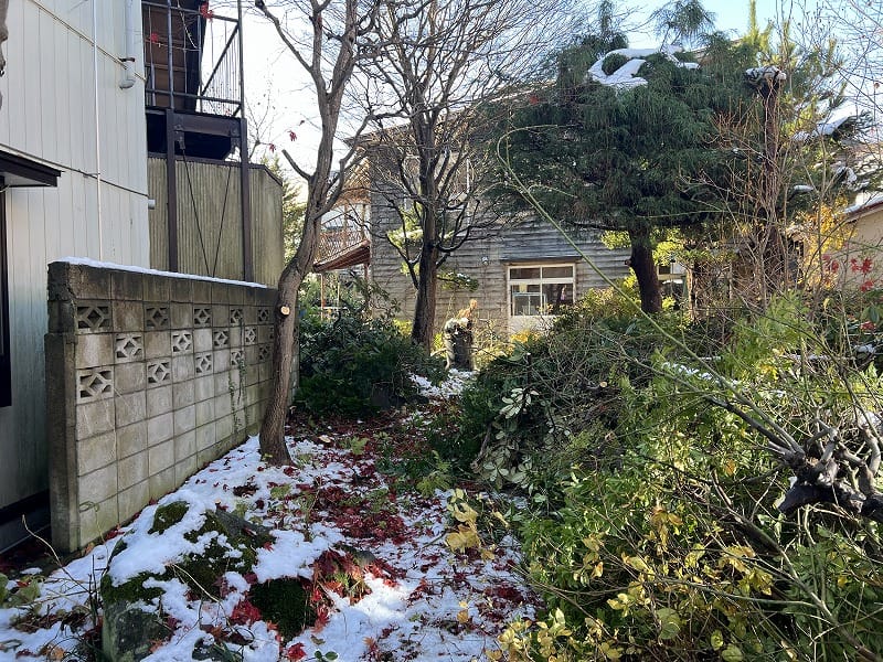 お庭の木が塀を超えて隣家まで張り出してしまっており、敷地内全体の伐採・処分のご依頼を頂きました。